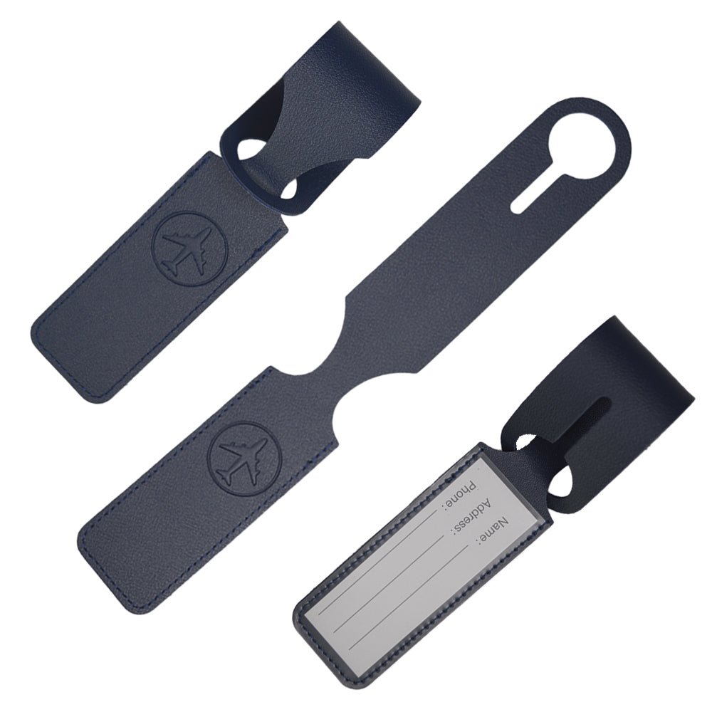 Elegante marca maletas en cuerina. Reverso en papel para información del equipaje. De 25.5 x 3.8 cm.