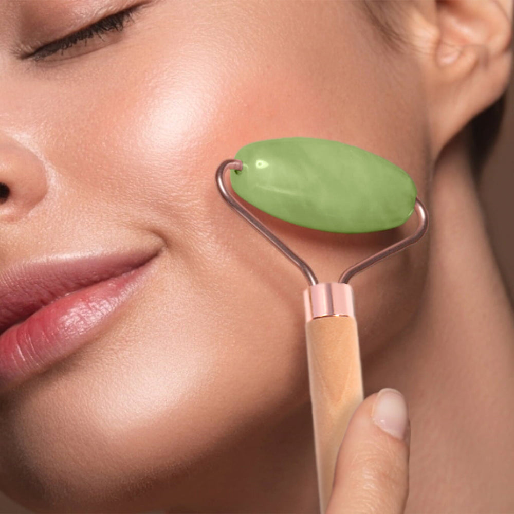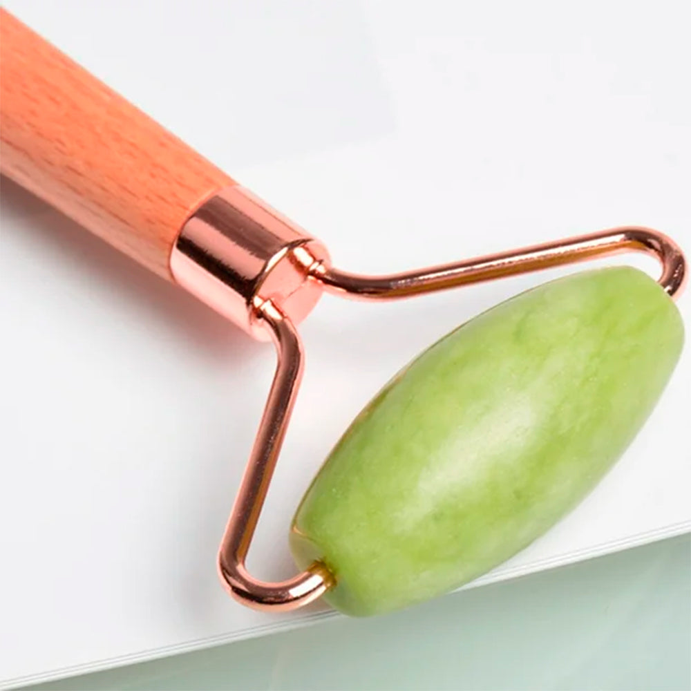 Roller facial con mango de madera y doble piedra jade natural de dos tamaños. De 5.8 x 14.3 cm.